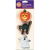 WILTON-Halloween Cookie Cutters. A 3 piece set of the most popular Halloween shapes; pumpkin (3Hx3W); Cat (3.25Hx3.5W) and Chost (3.25H x3.5W). Made of enamel coated steel with a rolled top edge. Recipes and directions are on the back of packaging. Imported. ' Read more